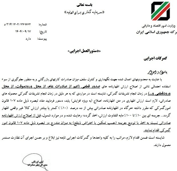در این بخشنامه آمده است: با عنایت به محدودیتهای اعمال شده جهت نگهداری و کنترل سقف میزان صادرات کارتهای بازرگانی و به منظور جلوگیری از سو استفاده احتمالی ناشی از اصلاح ارزش اظهارنامههای صدور قطعی (اعم از صادرات، عام از محل ورود موقت، از محل ورود قطعی و....) در زمان انجام تشریفات گمرکی، شایسته است در مواردی که به هر دلیل در زمان انجام تشریفات گمرکی محمولههای صادراتی لازم است ارزش اظهاری در متن، اظهارنامه اصلاح به ویژه افزایش یابد، دستور فرمائید مفاد تبصره ذیل ماده ۱۰۷ قانون امور گمرکی که مقرر داشته «هر گاه در اظهارنامه صادراتی بیش از ده درصد (۱۰٪) کمتر یا بیشتر ارزش کالا غیر واقعی اظهار گردد… جریمهای بین ۱۰ تا ۱۰۰% مابهالتفاوت ارزش اخذ گردد»، رعایت شده و در موارد شمول قبل از اصلاح ارزش اظهارنامه صادراتی نسبت به اخذ با تودیع جریمه (حسب تمکین با اعتراض ذینفع) به میزان مندرج در تبصره ذیل ماده ۱۰۷ قانون امور گمرکی اقدام نمایند.
